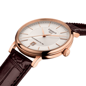 Tissot men's mechanical watch from the Carson T-Classic collection. Watch Name: Tissot Carson Premium Powermatic 80. Watch with 316 L stainless steel case with rose gold PVD treatment of round shape of size 40mm with thickness of 10.25mm and distance between the lugs of 20mm. Case with exposed case back and domed scratch-resistant sapphire glass. The dial is silver with indexes. The strap is made of brown leather and with a standard buckle. Swiss made watch with swiss automatic movement powermatic 80.111. Power Reserve: Up To 80 Hours Weight: 58 G. Waterproof watch Up To 5 bar (50 meters / 165 Feet).