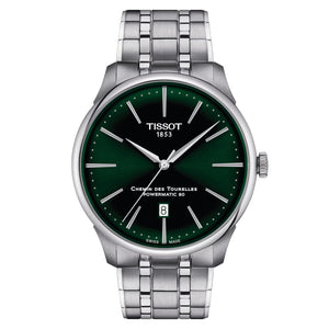 Close your eyes and think of a pure swiss watch and you’ll see the Chemin des tourelles. Named after the street that leads to tissot's home in the swiss mountains, it’s tissot’s icon round, classic, mechanical, ageless. Now updated and refined, this edition has a gently domed sapphire crystal that sits over a soft sunray dial with simple, elegant baton hour markers, each faceted to catch the light in an understated but sophisticated way. And under that is the nivachron powermatic 80, a state of the art automatic mechanical movement with an 80 hour power reserve and elevated anti magnetism. A watch for all time. Stainless Steel case and bracelet with green dial. Case size 42mm. Water resistance up to 50 meters. Domed scratch resistant sapphire crystal with antireflective coating. Interchangeable quick release bracelet butterfly clasp with push buttons.