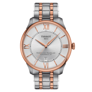 Named after the street leading to the home of Tissot in the Swiss mountains, the Chemin des Tourelles collection is one of the icons of the brand: round, classic, mechanical, timeless. Now updated and refined, this edition features a gently domed sapphire crystal that sits over a silver sunray dial with simple, elegant rose gold baton hour markers, each faceted to catch the light in an understated but sophisticated way. Nestled at the heart of this 42mm watch is our Nivachron Powermatic 80 movement, a state-of-the art automatic mechanical movement with an 80-hour power reserve and elevated anti-magnetism.
