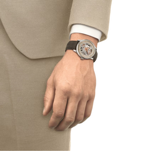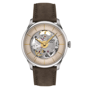 Tissot chemin des tourelles skeleton T-Classic automatic unisex watch T1398361626100. Stainless steel case with green leather strap, ivory dial. Water resistance up to 50 meters. Automatic movement. Case size 39 mm. Domed scratch-resistant sapphire crystal with antireflective coating. Interchangeable quick release bracelet, Butterfly clasp with push-buttons.