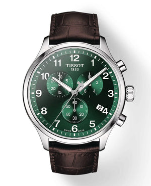 The Tissot Chrono XL watch can be defined by its large case with a diameter of 45 mm. The chronograph function accentuates its urban spirit. The Tissot Chrono XL collection offers a multitude of styles. Some may prefer the metal bracelet, others the vintage look of old-fashioned leather straps. Whichever model you choose, the Tissot Chrono XL is sure to reveal your personality. Stainless steel case with brown leather strap, green dial, case size 45mm. Quartz movement. Water resistance up to 100 meters. Scratch resistant sapphire crystal. Standard buckle.