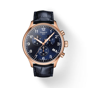 The Tissot Chrono XL watch can be defined by its large case with a diameter of 45 mm. The chronograph function accentuates its urban spirit. The Tissot Chrono XL collection offers a multitude of styles. Some may prefer the metal bracelet, others the vintage look of old-fashioned leather straps. Whichever model you choose, the Tissot Chrono XL is sure to reveal your personality. Stainless steel case rose gold PVD coating with blue leather strap, black dial, case size 45mm. Quartz movement. Water resistance up to 100 meters. Scratch resistant sapphire crystal. Standard buckle.