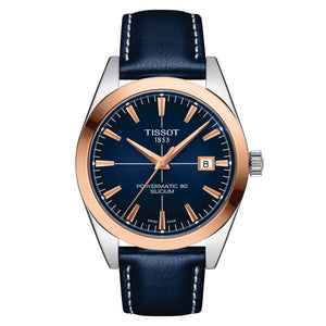 Tissot Gentleman Powermatic 80 Silicium Solid 18K Gold bezel T-Gold Automatic Men's Watch T9274074604100. Stainless steel case 18K rose gold bezel with blue leather strap, blue dial. Automatic movement. Case size 40mm. Water resistance up to 50 meters. Domed scratch resistant sapphire crystal. Butterfly clasp with push buttons.