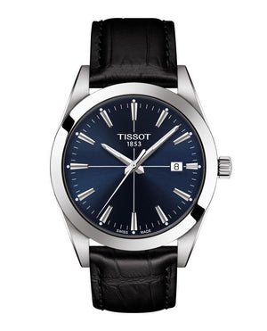 The Tissot Gentleman is the perfect everyday accessory and at the same time makes a stylish statement. The classically elegant watch comes with a case diameter of 40 mm and fits perfectly to every kind of style. The satin and polished hands and indices complete the elegant look of the Tissot Gentleman with Swiss-made quartz movement and scratch-resistant sapphire glass. This model has a 316L stainless steel case as well as a black leather strap with butterfly folding clasp with pushers and a blue dial with a date display. Water resistance up to 100 meters.