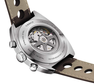 As innovators by tradition, Tissot celebrates its historic ties to motor-racing with a re-issue of a seventies style chronograph. The Tissot Heritage 1973 proudly flaunts its membership of Tissots historic stable. It symbolizes the partnership that brings together Tissot and the Kessel Classics racing team. Meeting contemporary requirements, this 43 mm wide chronograph is available in a limited edition of 1973 pieces. The overstitched calfskin strap is a reproduction of the one Tissot had invented and patented in the 1960s, characterized by its large perforations. It alludes to pilots steering wheels of the time. To power this racing machine, Tissot has fitted a reliable, powerful and tested engine, the ETA Valjoux 7753 self-winding movement. Case size 43 mm. Water resistance up to 100 meters.