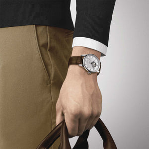 Tissot Le Locle Powermatic 80 Open Heart T-Classic Automatic Men's Watch T0064071603301. Stainless steel case with brown synthetic strap and silver dial. Automatic movement. Case size 39.3mm. Water resistance up to 30 meters. Scratch-resistant sapphire crystal. Interchangeable quick-release bracelet, butterfly clasp with push buttons.