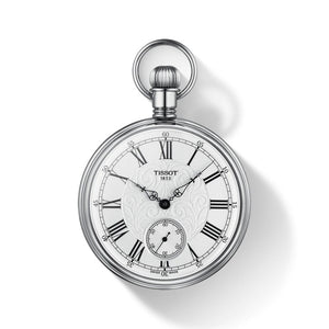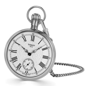 The Tissot Lepine Mechanical Pocket watches combine history and tradition with modern expertise. This collection offers a classic round pocket watch look with various dial designs depending on your own preference, always maintaining the vintage touch through its fine hands that provide a hint of nostalgia to the piece. Palladium plated brass case in daimeter 51mm. Mineral crystal glass with silver dail. Swiss mechanical movement power reserve of 46 hours.