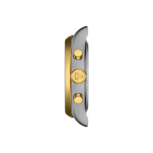 Tissot PR 100 chronograph T-Classic quartz mens watch T1504172203100. 316L Stainless steel case with yellow gold PVD coating and Stainless steel grey, yellow gold 1N14 bracelet with silver dial. Quartz movement. Case size 40 mm. Water resistance up to 100 meters. Scratch-resistant sapphire crystal. Interchangeable quick release bracelet, butterfly clasp with push-buttons.