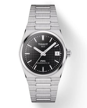Discover the tissot PRX 35mm powermatic 80, a captivating blend of timeless elegance and modern innovation. This 35mm watch features a high quality steel case and a sleek black dial, reimagining its iconic 1978 roots. The distinctive waffle dial pattern adds a touch of sophistication and sets the automatic model apart. Water resistant up to 100 meters and equipped with a Nivachron balance hairspring, the PRX is a versatile piece for discerning watch enthusiasts. The satin finish steel bracelet with a triple blade folding steel clasp ensures a comfortable fit. Embrace the allure of the Tissot PRX 35mm Powermatic 80 in black. Stainless steel case and bracelet with black dial. Automatic movement. Scratch-resistant sapphire crystal with anti-reflective coating.