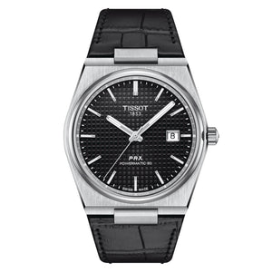 Tissot PRX powermatic 80 automatic mens watch T1374071605100. Stainless steel case with a black leather strap and black dial. Swiss automatic movement. Case size 40mm. Scratch resistant sapphire crystal with antireflective coating. Water resistance up to 100 meters. Interchangeable quick release bracelet, standard buckle.