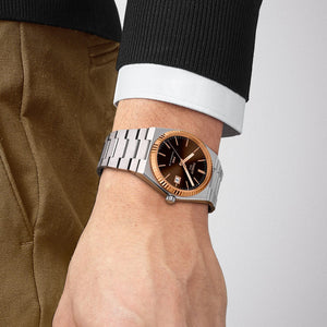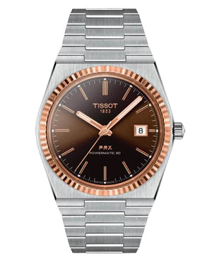 If you’re looking for a slim, smooth watch with an authentic ‘70s feel, look no further than the PRX Powermatic 80. Created for those with an eye for design and packed with twenty-first century features in a Tissot case shape from 1978, the PRX is a must-have on every watch fan’s wish list. The self-winding Powermatic 80 movement delivers reliability and precision thanks to the innovative Nivachron hairspring. With 80 hours of power reserve, it’s a modern movement designed to keep pace with busy lifestyles. Stainless steel case with 18K rose gold bezel. Stainless steel bracelet,with graded brown-black dial. Case size 40mm. Water resistance up to 100 meters. Scratch-resistant sapphire crystal with double-sided antireflective coating. Interchangeable quick release bracelet, butterfly clasp with push-buttons.