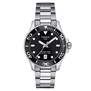 In crystal clear waters you can see the sun's rays breaking through the surface. In your mind only calm. On your wrist, the seastar 1000 the door to this underwater world. It chic, assertive and versatile. Whichever watch you choose, it comes with a 316L stainless steel case and bracelet, a uni-directional rotating bezel with a mineral glass insert, a screw-down crown, and water resistance up to 30 bar (300m / 1000ft)). And if you want, you can always quickly switch the bracelet for an orange, white, light blue, or black silicone strap. Change your outlook and step into another world. Stainless steel case and bracelet with black dial. Case size 36mm. Quartz movement. Scratch-resistant sapphire crystal with double-sided antireflective coating. Interchangeable quick-release bracelet, folding clasp with safety and push buttons.