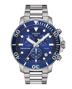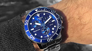 The Tissot Seastar 1000 merges style and performance without compromising either. The diving inspiration shapes both the appearance and the functionality of this watch. It maintains its performance to a pressure of 30 bar (300m/1'000ft), combining underwater sports and a preference for a sophisticated Swiss timepiece. The diving theme continues through elements such as a unidirectional bezel, a strap with a divers' buckle and extension, plus luminescent hands and markings. 45.5mm stainless steel case. Aluminium bezel ring, Anti-clockwise rotating bezel, Screw-down crown and case back, Screw-down pushers. Scratch-resistant sapphire crystal with double-sided antireflective coating. Swiss quartz movement with 30-minutes and 1/10 of a second counters, central 60-seconds chronograph hand, ADD and SPLIT functions.