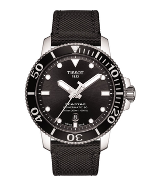 The Tissot Seastar 1000 merges style and performance without compromising either. The diving inspiration shapes both the appearance and the functionality of this watch. Stainless steel case with black textile strap. Scratch-resistant sapphire crystal with black dial color. Butterfly clasp with push-buttons. The case in diameter 43mm and it maintains its performance to a pressure of 30 bar (300m/1'000ft). The Tissot Seastar 1000 Powermatic 80 powered by an automatic Powermatic 80 Swiss movement of up to 80 hours power reserve reconfirms the proven Tissot talent for encapsulating operational excellence in stunning design.