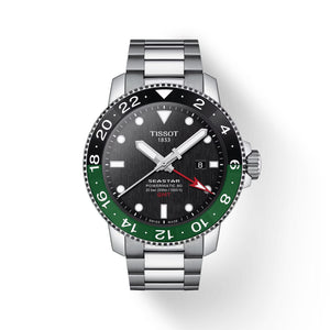 Tissot seastar 1000 powermatic 80 GMT automatic mens watch T1204291105101. Stainless steel case and bracelet with black dial. Automatic movement. Water resistance up to 300 meters. Case size 46 mm. Domed scratch resistant sapphire crystal with antireflective coating. Folding clasp with safety diver extension and push buttons interchangeable quick release bracelet.