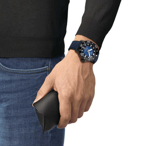 Wherever you go and whatever adventure you find yourself on, you’ll find balance with the Seastar 2000 Professional Powermatic 80 on your wrist. This is a highly technical, assertive watch that’s brimming with easy confidence, whether you take it deep into the urban jungle, or hundreds of metres below the surface of the sea. With its chic, stylish profile, it’s a versatile piece you can wear everyday. But with its muscular architecture, up to 60bar (600m / 2000ft) of water resistance and ISO 6425 (2018) diver’s watch certification, it’s the tool watch you can rely on when you need it most, too. Specifications include a uni-directional rotating bezel with a ceramic bezel insert, a screw-down crown, an automatic helium escape valve and a water-proof black rubber and blue fabric strap. A black or gradient blue to black dial with a wave motif is the symbol of its impeccable underwater credentials. Stainless steel case with black PVD coating. Automatic movement. Case size 46mm. Domed scratch resistant sapphire crystal with antireflective coating. Interchangeable quick release bracelet, standard buckle.