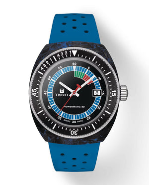Discover the Tissot Sideral, a captivating fusion of vintage allure and modern craftsmanship. The watch features a 41mm wide forged carbon case and a striking blue strap. The dial exhibits a multi-coloured luminescent animation, amplifying its distinct appeal. Water-resistant up to 30 bar (300 meters) and equipped with Super-LumiNova® coated indices, the Sideral is a statement piece for trendsetters and history enthusiasts. Effortlessly modify your look with the interchangeable perforated rubber strap. Stand out from the crowd with the tissot sideral. Automatic movement. Domed scratch resistant sapphire crystal with antireflective coating.