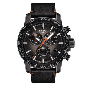 The supersport chrono basketball edition is a modern and masculine sports chronograph watch that brings together quality swiss watchmaking and design with the high energy dynamics inspired by Tissot’s long association with basketball. The gradient black dial with an original basketball net pattern and orange corner stitching on the bracelet are a nod to this discipline and its culture. With a 45.5 mm stainless steel case with black PVD coating, it features a fixed bezel with a tachymetric scale, the Supersport has a great deal of character. It is equipped with an end of life feature that will let you know when the battery needs to be replaced and the indices and hands are coated with Super luminova for easy visibility of the time, making this the ideal accessory of men with assertive style. If you want to add an extra personal touch, you can even personalise it by combining it with another bracelet thanks to its easy interchangeable system. Stainless steel case with black leather strap, graded grey black dial. Case size 45.50mm. Water resistance up to 100 meters. Scratch resistant sapphire crystal. Standard buckle clasp.