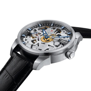 Tissot is revealing the innermost secrets of its deep-rooted expertise in precision watchmaking with this men’s watch, the Tissot T-Complication Squelette. In this watch, modernity meets meticulous craftsmanship via a wheel-inspired design and a hand-wound, mechanical skeleton movement visible through the dial. Luxurious finishes and design details seamlessly link tradition with contemporary styling for wearers who love to bear witness to the visible connections between yesterday, today and tomorrow. Stainless steel case with a black leather strap, transparent dial. Case size 43mm. Water resistance up to 50 meters. Mechanical movement. Domed scratch-resistant sapphire crystal with double-sided antireflective coating. Butterfly clasp with push-buttons.