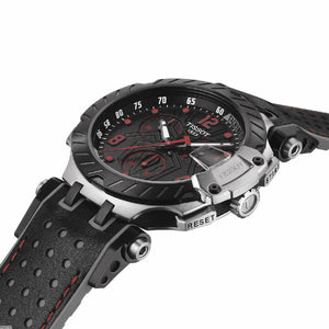 The new line stays true to the essence of the Tissot T-Race, with features inspired by motorcycle. A new dial is emblazoned with Marc Marquezs signature ant motif, a sporty and technical strap takes the color code of Marc Marquez with grey rubber, black leather and red stitching.Case siza 43 mm. Water resistance up to 100 meters.