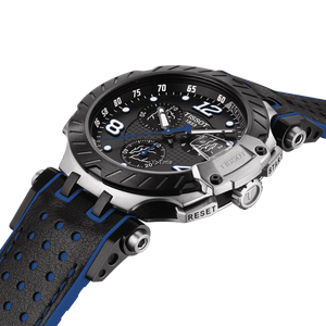 The new line stays true to the essence of the Tissot T-Race, with features inspired by motorcycle. Each detail of the watch features bespoke design elements to reflect the most our ambassador and to insure an easy and clear readability with white SuperLuminova® on several elements of the watch like the counters and indexes. His 12 logo engraved on the caseback highlighting the runners symbols, a sporty and technical strap with shade of blue such as a contrast blue stitch on the perforated racing strap.Case size 43 mm. Water resistance up to 100 meters.