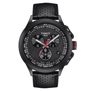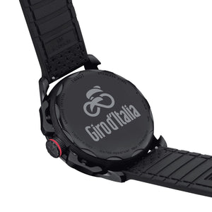 A historic start in Budapest, brutal ascents through the Alps, and a ferocious fight to finish with with the maglia rosa in Verona... th is year's Giro will inspire people around the world. And the Tissot T Race Cycling 2022 Giro d'Italia Special Edition is the perfect watch for them, bringing together Swiss precision and reliability with a classic design inspired by racing bikes. With the race logo engraved on the caseback and iconic pink trim on the second hands and crowns, wearing this watch will bring you closer to the glory in Italy. Stainless steel case black PVD coating with a carbon composite black dial, black leather strap. Quartz movement. Case size 45mm. Water resistance up to 100 meters. Scratch resistant sapphire crystal with antireflective coating. Interchangeable quick release bracelet. Standard buckle