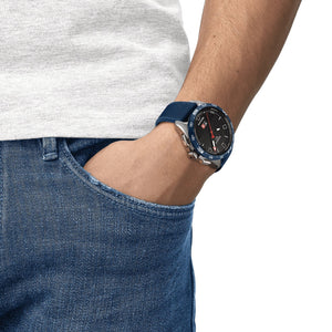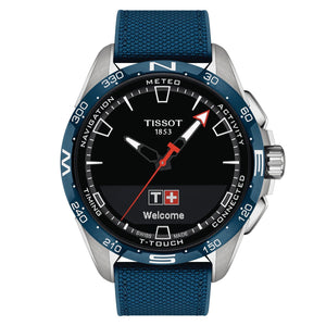 Tissot T-Touch connect quartz solar mens watch T1214204705106. Antimagnetic titanium case with a blue textile strap and blue dial. Quartz solar movement. Case size 47.5mm.Tactile scratch-resistant sapphire crystal. Water resistance up to 100 meters. Interchangeable quick-release bracelet. Standard buckle clasp.