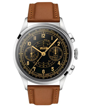 Relive the glory days of sports timekeeping with the stylish new Tissot Telemeter 1938. This beautiful, vintage-inspired timepiece has two railroad sub-dials and a telemeter scale for measuring the distance between an event. Tissot has chosen the Telemeter 1938 to house the newly upgraded Valjoux A05.231 automatic chronograph calibre. This is now equipped with a highly durable Nivachron balance spring and an extended 68-hour power reserve. It’s finished off with a new Tissot Heritage rotor design. This timepiece is a symbol of timekeeping history and a must-have for any watch enthusiast. Stainless steel case with light brown leather strap, black dial. Automatic movement. Case size 42 mm. Water resistance up to 30 meters. Domed scratch-resistant sapphire crystal with double-sided antireflective coating. Butterfly clasp with push buttons.