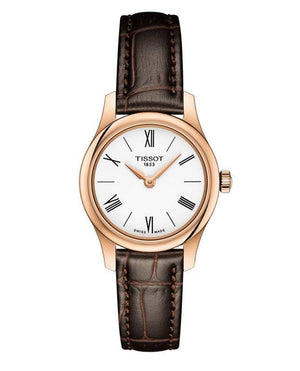 The Tissot Tradition family gives ultra-modern watchmaking a justified hint of nostalgia. High-tech operation is perfectly balanced with classical details and subtle vintage-look finishes. These are complemented by design elements such as guilloche decoration and a gently curved case. The Tissot Tradition promises wearers endless hours of precision with sustainable good looks. Case size 25 mm. Water resistance up to 30 meters.