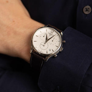 The Tissot Tradition models are modern timepieces inspired by 1950s design. The vintage-style design is perfectly balanced with the classical details and subtle finishes such as guilloche decoration and a gently curved case. Case size 42 mm. Water resistance up to 30 meters.