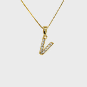 Yellow Gold Plated Sterling Silver Cubic Zirconia Letter V Pendant. This pendant is a stylish and personalized accessory that features the letter V in cubic zirconia stones. The pendant is made of sterling silver and plated with yellow gold for a luxurious look. The pendant comes with a matching silver chain that complements the pendant’s shine. This pendant is a great gift for yourself or someone who has the initial V in their name. It is a versatile piece that can be worn with any outfit and for any occasion.
