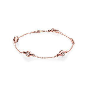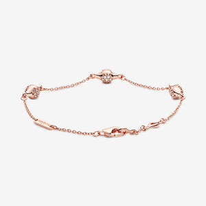 A modern rendition of our classic LovePods jewellery, this Pandora Rose chain bracelet is accented with flower bud-inspired adornments covered in cubic zirconia stones. The 14k rose gold-plated unique metal blend glows with a blush-pink hue. Wear it solo or layer with similar pieces from our collection to create a look that's naturally you.