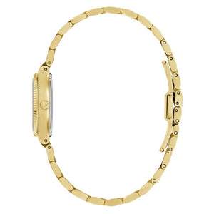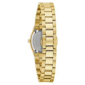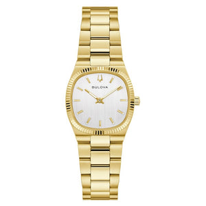 Drawing inspiration from the incredible Bulova Super Seville of the 1970s, the Super Seville Mini delivers classic aesthetics for timeless appeal. With versatility for every wardrobe, the 25mm gold-tone stainless steel case impresses with a seamless silhouette transitioning into the matching integrated 3-link stainless steel bracelet, which features a push-button deployant clasp. An elegant, fluted bezel enhances the case and surrounds a flat sapphire crystal. The compelling dial is in a vertically brushed silver, with polished gold-tone hands and indices. Embrace an effortless elegance with the women’s Bulova Super Seville Mini.