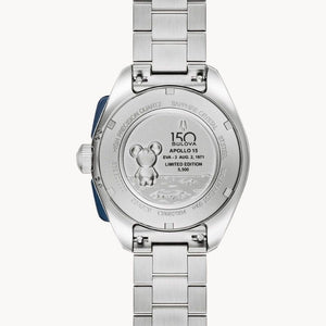 In collaboration with famed Brazilian artist Thiago Rosinhole, Bulova’s legendary Lunar Pilot chronograph is revisited for Bulova’s 150th Anniversary, combining Bulova’s legacy of precision timing with Rosinhole’s unique style of fusing street art and pop culture for this new limited-edition Lunar Pilot timepiece. Beneath the flat sapphire crystal, the watch takes a striking turn with a mesmerizing Timascus dial, crafted from titanium that has been folded through the Damascus process to achieve its captivating pattern. Slim, blue chronograph pushers and a crown featuring the Bulova tuning fork accent the 43.5mm silver-tone stainless steel case, while six-hand chronograph functionality with timing to 1/20th second, silver registers, and Super-Luminova applied to the hands and markers complement the dial’s blue tachymeter ring. Powered by our proprietary high-precision quartz movement, resonating at a frequency of 262khz for unparalleled accuracy and allowing a sweeping chronograph hand , the watch is paired with a matching 3-link silver-tone stainless steel bracelet and features an individually numbered case back embossed with Rosinhole’s signature Budii figure. A modern interpretation of a historic timepiece with a unique twist, the Bulova Lunar Pilot is the ideal watch for today’s explorer and is presented in special packaging, including a storybook and a signature 6-inch Budii figurine designed by the celebrated artist, exclusively for this collaboration. Limited to 5,500 pieces worldwide.
