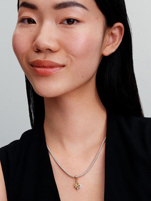 A 14k gold-plated North Star charm casts a warm glow with a radiant bezel-set lab-grown diamond at its centre. A sterling silver disc dangles next to it featuring the engraved message "GOOD THINGS ARE COMING" on one side, and a blank, engravable canvas on the other.