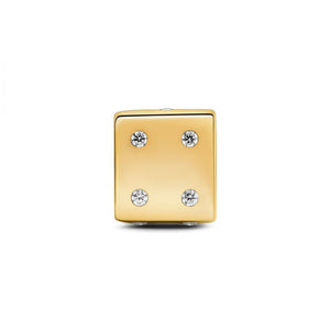 Add a touch of playfulness to your collection with the Sparkling Dice Charm. Plated with lustrous 14k gold, this Pandora dice charm features intricately set clear cubic zirconia stones representing classic dice pips. With sides showcasing numbers one, four, six and three, this charm invites you to embrace the unpredictability of life. Roll the dice and seize the opportunity, for in every sparkle lies the thrill of chance and the hope for something extraordinary.