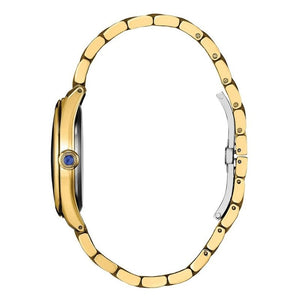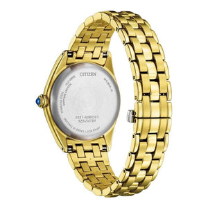 Gold-tone stainless steel case and bracelet. Fixed gold-tone stainless steel bezel. Blue dial with gold-tone hands and index-Roman numeral hour markers. Minute markers around the outer rim. Dial Type: Analog. Citizen Caliber Eco-Drive E031 eco-drive movement. Scratch resistant sapphire crystal. Pull / push crown. Solid case back. Round case shape, case size: 33 mm. Deployment with push button release clasp. Water resistant at 50 meters / 165 feet. Functions: hour, minute, second, solar-powered. Citizen L Classic Series. Casual watch style. Watch label: Japan Movt. Citizen L Classic Eco-Drive Blue Dial Ladies Watch EM1142-84L.