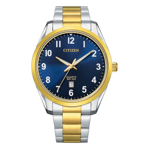 Two-tone (silver-tone and gold-tone) stainless steel case and bracelet. Fixed gold-tone stainless steel bezel. Blue dial with gold-tone hands and Arabic numeral hour markers. Minute markers around the outer rim. Dial Type: Analog. Luminescent hands. Date display at the 6 o'clock position. Quartz movement. Pull / push crown. Solid case back. Round case shape, case size: 42 mm. Deployment with push button release clasp. Water resistant at 100 meters / 330 feet. Functions: date, hour, minute, second. Casual watch style. Watch label: Japan Movt. Citizen Quartz Blue Dial Men's Watch BI1036-57L.