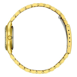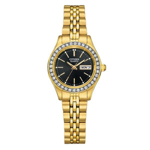 Citizen’s Quartz dress watch is a timeless classic, with a gold-tone stainless steel bracelet and striking black dial with Crystal accents on bezel. This watch features Day / Date, 3 Hand and Fold Over Clasp with Push Buttons.