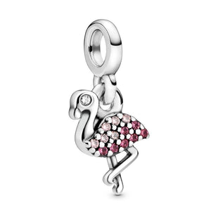 Get ready to go tropical with the my Pink Flamingo dangle charm. Cerise crystals, fancy fairy tale pink and a single clear cubic zirconia create shaded pink Pave effect on the front of this Pandora Me charm. Turn it over to reveal beaded sterling silver on the back. Designed in collaboration with actress, model and activist Millie Bobby Brown, the charm is inspired by the symbols of summer, ocean, travel and self-discovery, but only you can decide what it means to you.