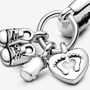 What better way to celebrate a new baby's arrival than with our beautifully crafted dangle charm in sterling silver? The polished piece holds an adorable trio of baby essentials: a bottle, booties and a heart embossed with footprints. It's punctuated with sparkling cubic zirconia accents and touches of hand-applied white enamel. Wear it as a reminder of your new arrival or to the new mum in your life.