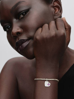 Wear your heart on your sleeve, literally. This sterling silver dangle charm pairs a purple man-made crystal with an engravable back — crafted to carry your most meaningful words.