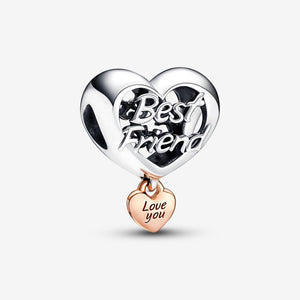 Love is two-toned in this charm that celebrates everlasting friendships and the joy they bring. An engraved, 14k rose gold-plated heart dangles below a sterling silver heart inscribed with the words "Best Friend”. Style this charm on your charm holder of choice and let your BFF know she means the world to you.