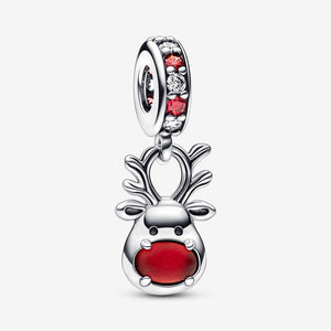 Brighten your holiday season with the Red Nose Reindeer Murano Dangle Charm. This cheery sterling silver reindeer charm features detailed antlers and an iconic red nose created from frosted matte Murano glass. On the reverse, a heart cut-out reveals the festive red of the Murano, and below the heart is the engraving "Let your light shine." The bail is decorated with clear and red cubic zirconia stones for an added touch of holiday magic.