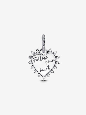 Add a playful twist to your style with the Spinnable Arrow Heart Dangle Charm. Crafted from sterling silver, it features a red lab-created opal heart framed by shimmering clear cubic zirconia stones. The sterling silver arrow spins around, and the back of the heart is engraved with "Follow your heart". The Pave-set stones on the bail add just the right amount of sparkle. Wear this charm on a bracelet or necklace as a reminder to follow your heart, every day.