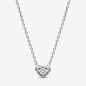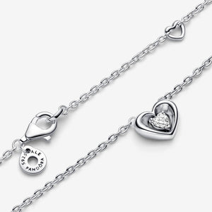 A heartfelt gift. Hand-finished in sterling silver, our Radiant Heart & Floating Stone Pendant Collier Necklace features a 3D open heart pendant set with a heart-shaped stone within, symbolizing the radiating energy of love. The pendant is fixed to the chain detailed with two heart-shaped jump rings for versatile styling. Give this collier necklace to the one who makes your heart race.