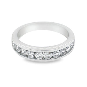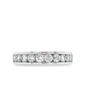 This glorious designed women's ten diamond anniversary band. This gorgeous band has center-hosted ten slightly large diamonds in white gold channel set to add to glitter. A total of 1.00 carat of diamonds are set in 14K white gold.