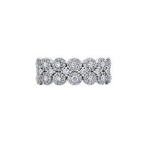 This is a stunning and elegant ring that features a fancy band design with 1.13TDW of diamonds in 14K white gold. The ring is made up of a series of flower-like clusters of diamonds, creating a sparkling and elegant design. The diamonds are round cut and are set in a prong setting. The band is made of 14K white gold and has a polished finish.