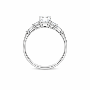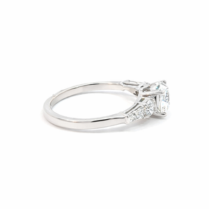 This exquisite 14K white gold engagement ring features a sparkling 1.00-carat lab-grown center diamond with a total diamond weight of 1.50 carats. The round center stone is complemented by side diamonds for added brilliance, creating a classic and refined three-stone look. The polished white gold band enhances the overall shine, making this ring a timeless choice for any special moment.