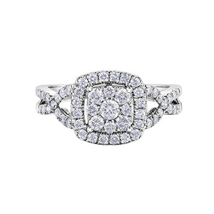 This beautiful engagement ring features a dazzling round diamond in the center of a square halo of smaller diamonds. The ring is crafted in 10K white gold and has a split shank design that adds elegance and sparkle. The total diamond weight of this ring is 1.00 carat, making it a perfect choice for your special someone.